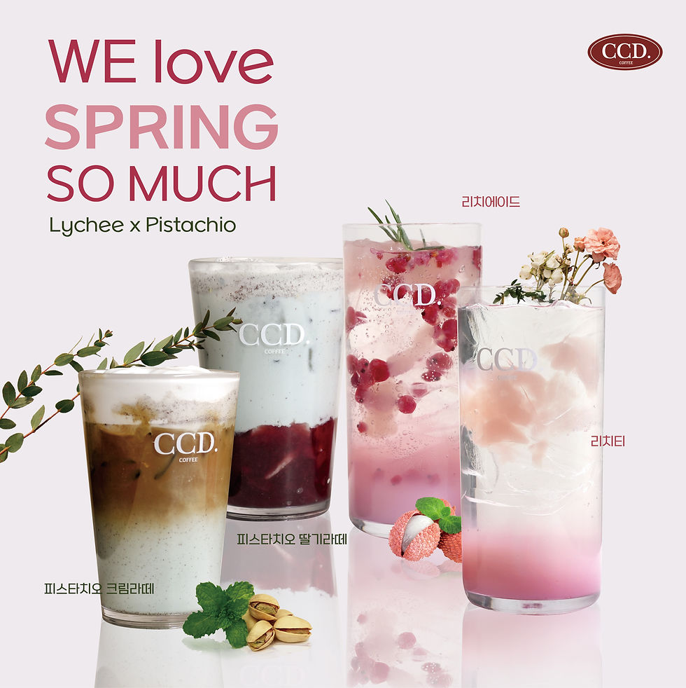 봄 색감, 느낌, 맛 가득 담은✨신메뉴 4종 출시✨고소하고 달콤한 피스타치오에부드럽고 담백한 CCD크림이 올려진💘피스타치오크림라떼새콤 상큼함이 더해진 💘피스타치오딸기라떼상큼하고 청량감 가득한 봄을 가득담은💘리치에이드&티CAFE CCD.에서 만나보세요